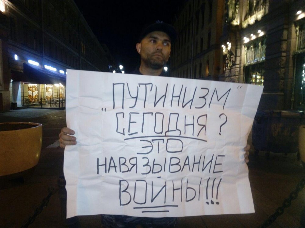 В Санкт-Петербурге во время пикета на Малой Садовой задержали участника «Бессрочного протеста» Семена Ткачука из-за плаката «Путинизм сегодня — это навязывание войны». Об этом сам задержанный сообщил на горячую линию ОВД-Инфо.