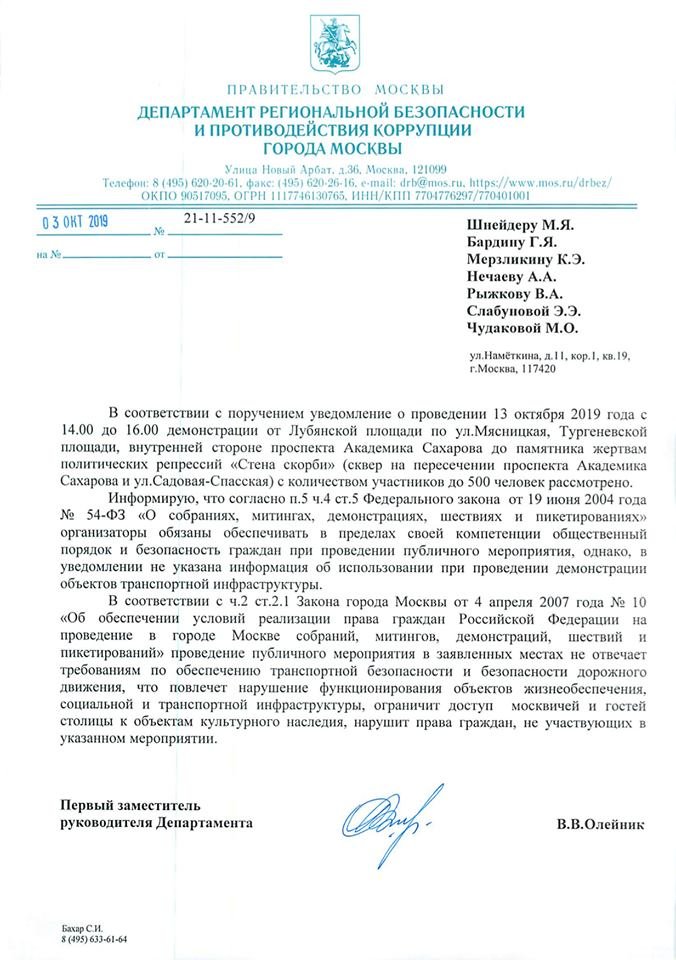 Чиновники уверены, что такой маршрут шествия нарушит права граждан, не участвующих в публичном мероприятии, создаст помехи в доступе граждан к объектам транспортной инфраструктуры, а также «ограничит доступ москвичей и гостей столицы к объектам культурного наследия».