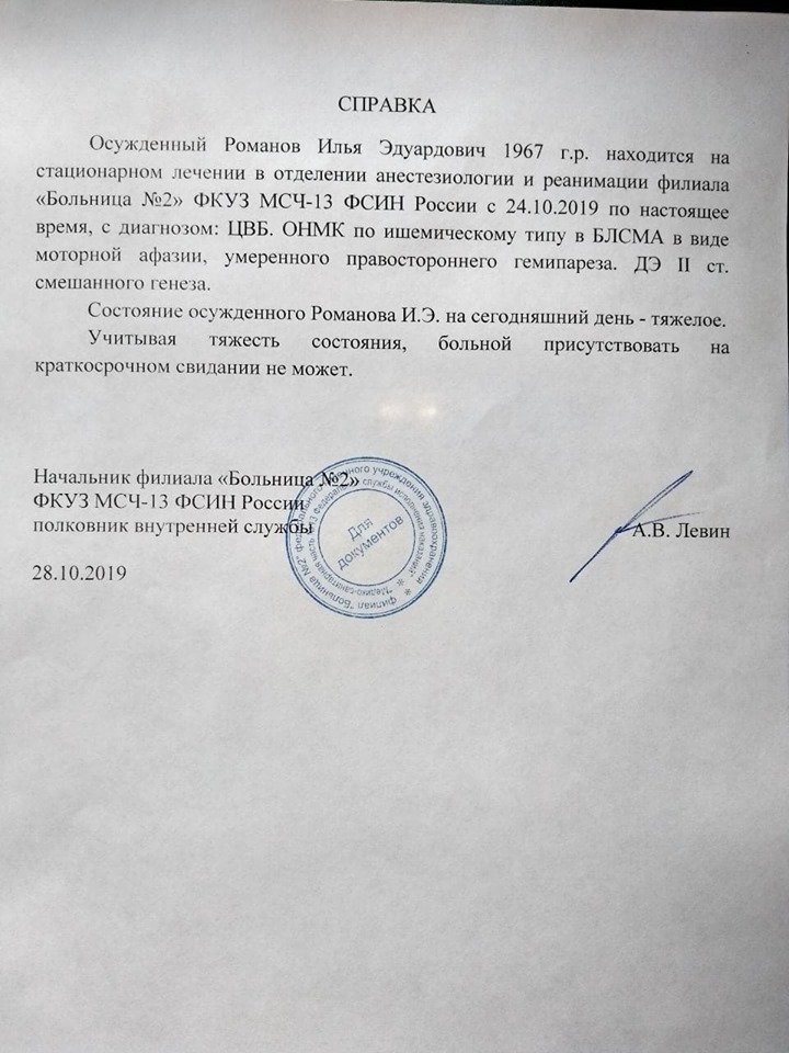 Илью Романова «в экстренном порядке» госпитализировали примерно 24 октября после инсульта ишемического типа. Родным сообщили об этом лишь 28 октября, пишет Лариса Романова. Заключенный полностью парализован и находится в реанимации ЛПУ-21 поселка Барашево республики Мордовии. По информации профсоюза «Рабочий контроль», заключенный также не может говорить и понимать речь.