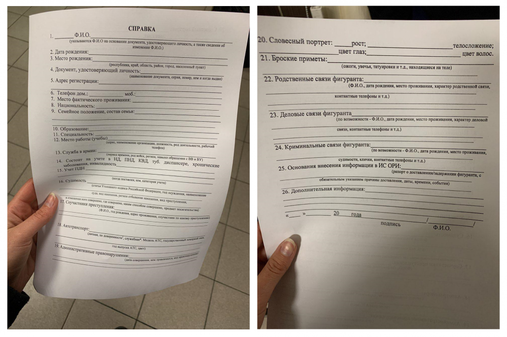 В ОВД «Сокол» задержанным раздали анкеты, где требуют указать адрес, цвет глаз, телосложение, место работы, учебы, национальность и другие личные данные. Всех принудительно сфотографировали.