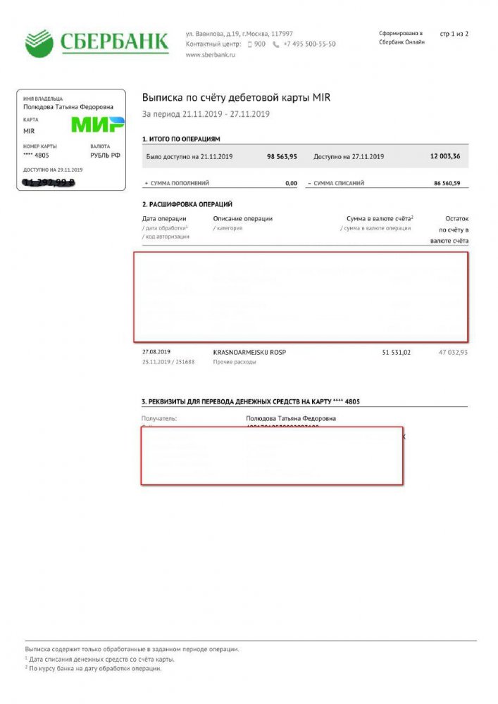 Полюдова пояснила, что ранее мать по ошибке заплатила штраф за Дарью. Сбербанк вернул средства на счет. Затем позднее сотрудники банка позвонили Татьяне Полюдовой и сообщили, что служба судебных приставов прислала в банк документы, из которых следовало, что штраф оплатили правильно. С матери Дарьи Полюдовой повторно списали 51 535 рублей. В выписке по операциям в «Сбербанк Онлайн» указано, что списание было 27 августа, ниже стоит дата 25 ноября.
