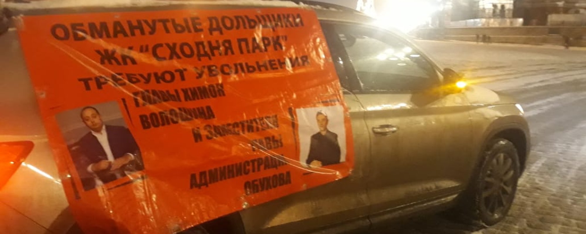 Она рассказала, что причиной для задержания Андрея стал плакат на автомобиле с текстом: «Обманутые дольщики ЖК „Сходня парк“ требуют увольнения главы Химок Волошина и заместителя главы администрации Обухова».