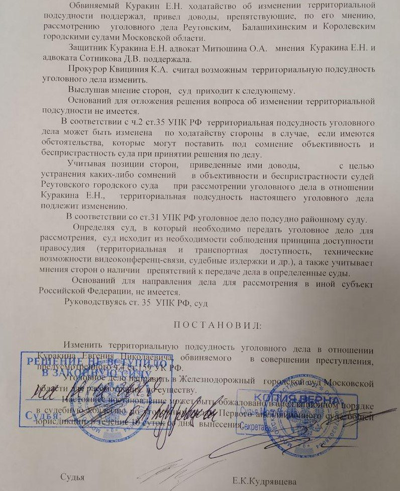 - В августе Реутовский суд Московской области постановил вернуть материалы дела Евгения Куракина в прокуратуру. В ноябре дело вновь направили для рассмотрения по существу, однако защита и обвинение попросили изменить подсудность уголовного дела.