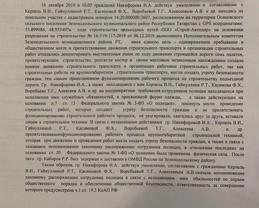 Ирина Никифорова добавила, что на всех задержанных составили почти одинаковые протоколы. По мнению силовиков, лагерь активистов создал помехи свободному передвижения строительной техники и организации строительных работ. При этом участники лагеря якобы не выполнили требования полицейских и не прекратили препятствовать строительным работам.