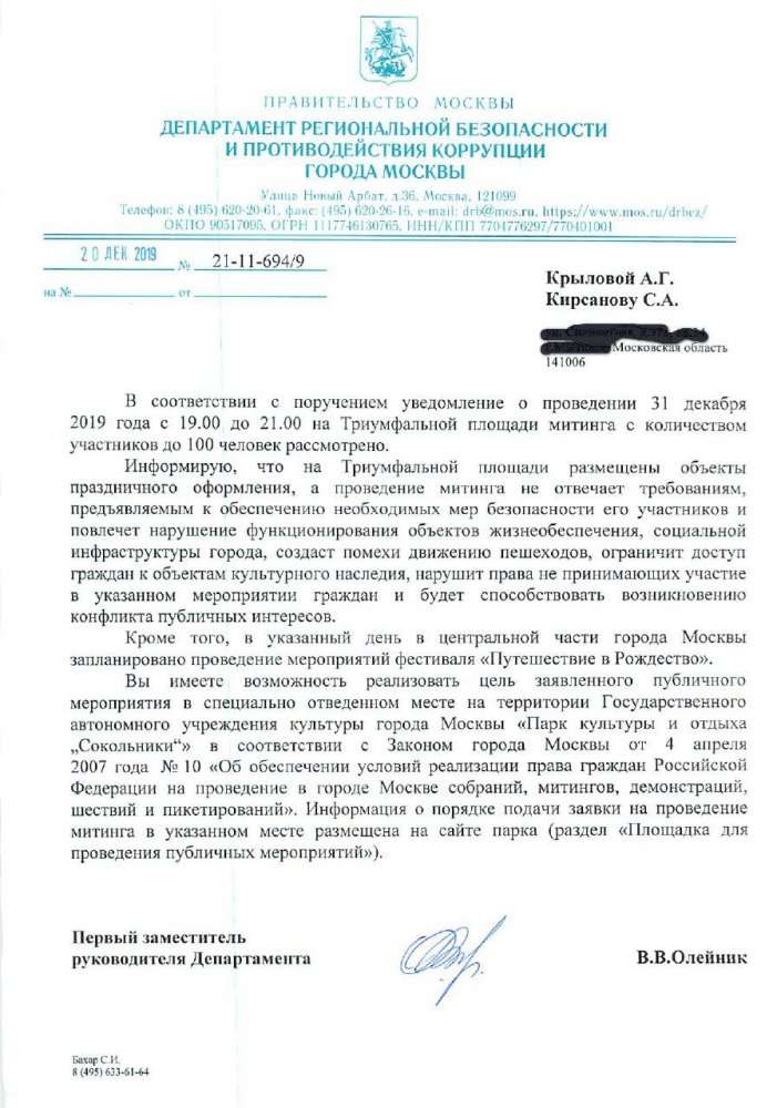 Митинг был запланирован на вечер 31 декабря с количеством участников до 100 человек. В своем ответе мэрия указала, что из-за праздничных мероприятий невозможно будет обеспечить безопасность участников акции и случайных прохожих, и что также может возникнуть конфликт интересов.