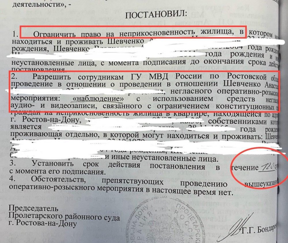 Адвокат Шевченко Сергей Бадамшин выложил фотографию решения суда и пояснил, что «30 августа 2018 года суд разрешил ЦПЭ ГУ МВД России по Ростовской области установить „прослушку“ для аудио и видеозаписи в жилище Анастасии Шевченко, обвиняемой за участие в нежелательной организации. Кроме того за Анастасией осуществлялось наружное наблюдение».