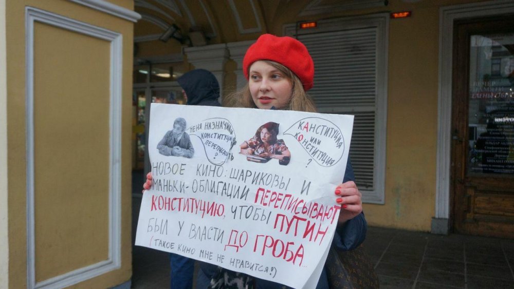 Малышева стояла с плакатом «Новое кино: Шариковы и Маньки-облигации переписывают Конституцию, чтобы Путин был у власти до гроба».