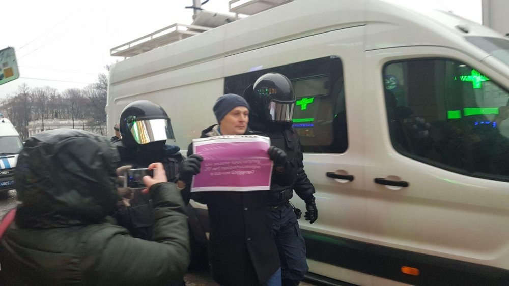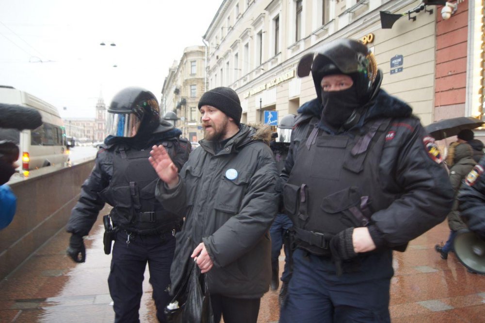 Группа бойцов ОМОНа задержала Дмитрия Гусева возле угла Садовой улицы и Невского проспекта. Гусев был без плаката, причины задержания неизвестны.