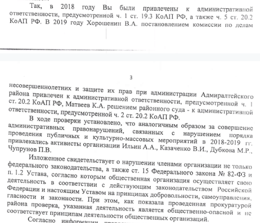 «Деятельность активистов общественной организации осуществляется от ее имени с нарушением федерального законодательства, указанные лица на системной основе привлекаются к административной и гражданско-правовой ответственности за нарушение порядка проведения публичных мероприятий и совершение иных правонарушений», — делает вывод прокуратура в представлении.