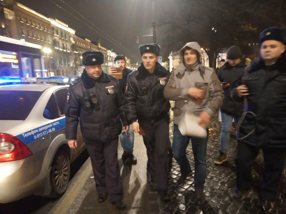 Первым задержали Вадима Казака (Десятскова) после того, как он отказался подписать предупреждение о правилах проведения публичного мероприятия. Затем задержали четырех человек с плакатами, среди них Евгений Мусин и Марина Кен.