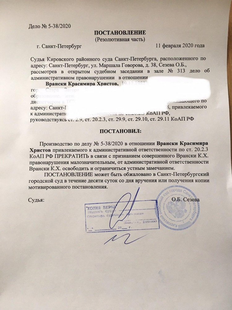 Кировский районный суд Санкт-Петербурга 11 февраля прекратил административное делопроизводство в отношении координатора движения «Красивый Петербург» Красимира Врански. Об этом активист сообщает в телеграм-канале.
