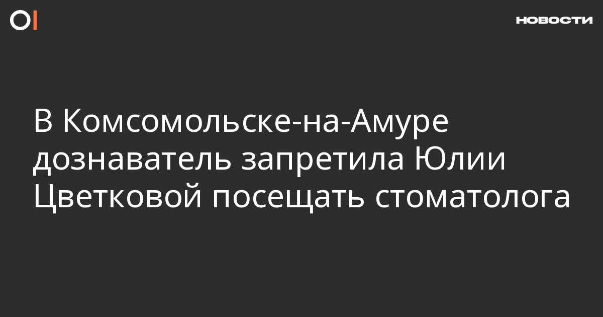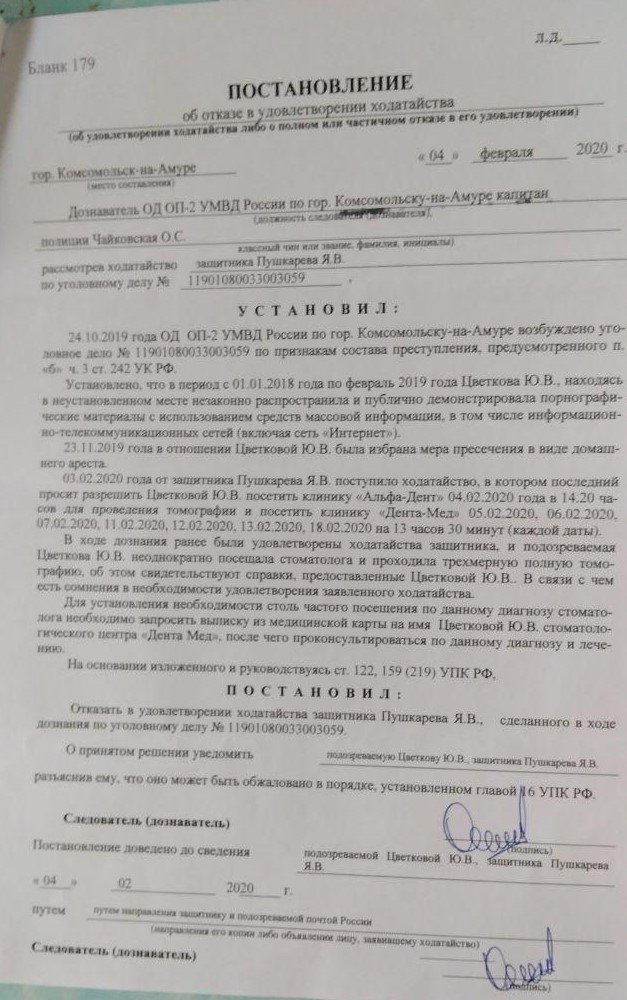 В Комсомольске-на-Амуре дознаватель отказалась удовлетворить ходатайство ЛГБТ-активистки Юлии Цветковой с просьбой разрешить ей несколько раз посетить врача-стоматолога. Об этом ОВД-Инфо сообщила мать Цветковой Анна Ходырева.