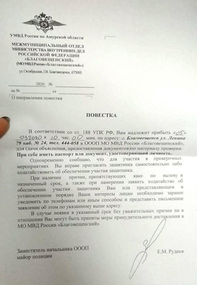 5 марта к 10 часам утра по местному времени Дину вызвали в отдел полиции «для дачи объяснения по материалам проверки».