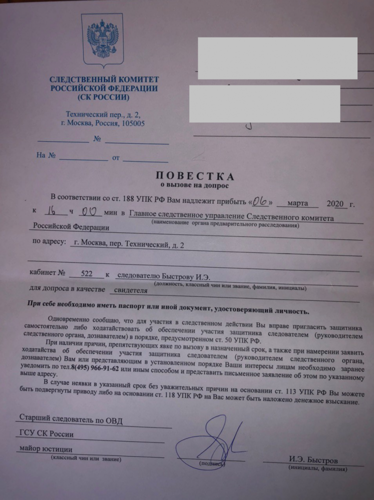 В 235-ом гарнизонном военном суде пришедшим на заседание к фигурантам дела «Черного блока» раздали повестки на допрос в Главное следственное управление Следственного комитета. Об этом ОВД-Инфо сообщил блогер Денис Стяжкин.