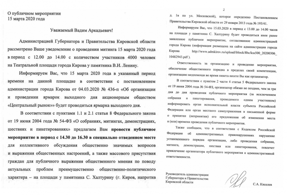 Однако власти отказались согласовать митинг, сославшись на то, что 15 марта на Театральная площади будет ярмарка выходного дня. Остальные 30 вариантов чиновники проигнорировали, но предложили активистам провести митинг в другое время и в другом месте — у памятника Степану Халтурину на окраине города.