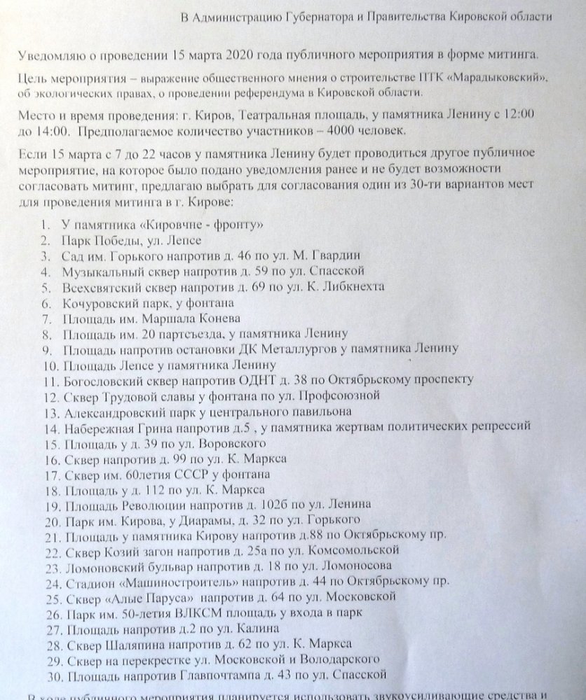 Движение «Нет Марадыковский» запланировало двухчасовой митинг на 15 марта — в день общероссийского экопротеста. Активисты хотели провести митинг на Театральной площади. На случай, если это место будет занято другими мероприятиями, заявители предложили чиновникам еще 30 дополнительных площадок для митинга.