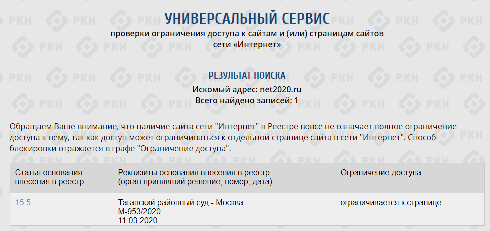 — указывает ведомство на своем сайте. Как пишет Роскомнадзор, ресурс заблокирован по решению Таганского районного суда от 11 марта 2020 года.