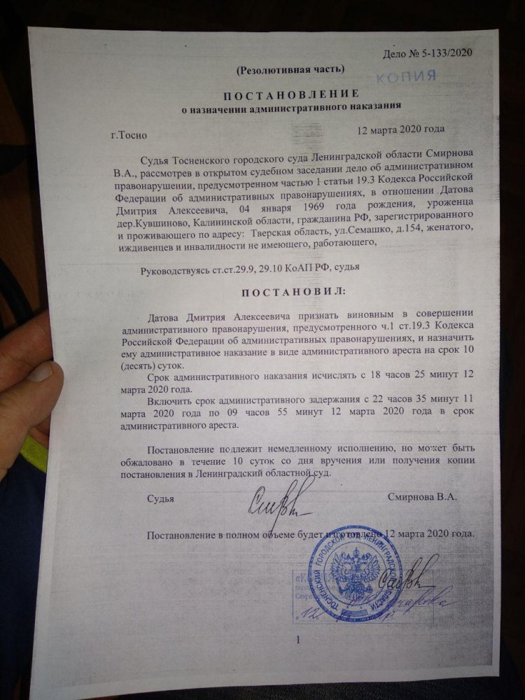 Дальнобойщика задержали вечером 11 марта у Бабинского поста ДПС из-за того, что он отказался показывать документы инспектору без должных на то оснований. После задержания на Датова составили протокол по части 1 стати 19.3 КоАП (неповиновение законным требованиям сотрудника полиции). На следующий день его привезли в суд.