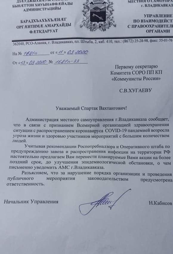 Администрация Владикавказа не согласовала митинг в защиту конституционных прав россиян, заявленный на 17 марта партией «Коммунисты России». Об этом сообщается на сайте партии.