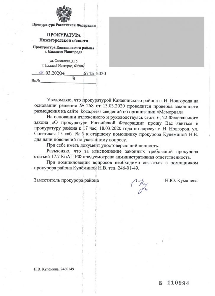 Главному редактору «KozaPress» Ирине Славиной прислали повестку из прокуратуры Нижегородской области в связи упоминанием Правозащитного центра «Мемориал» в публикации. Об этом ОВД-Инфо сообщила сама Славина.