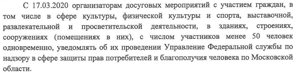 Заголовок и текст новости изменены: ранее мы ошибочно писали, что запрещены публичные мероприятия с численностью более 50 человек, однако на территории МО запретили любые публичные мероприятия
