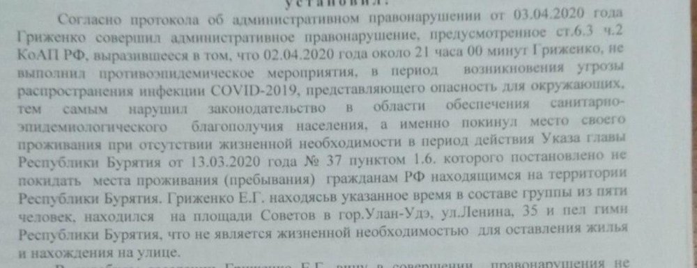 Эльвиру Ендонову, Баира Нимаева, Евгения Гриженко и Сергея Кислова суд признал виновными по статьям о неповиновению законному распоряжению полицейских (ст. 19.3 КоАП) и о нарушении режима самоизоляции (ст. 6.3 КоАП). Им назначили 10 суток административного ареста по статье 19.3 КоАП, а также штрафы в 15 тысяч рублей по статье 6.3 КоАП. Адвокаты настаивали, что нет правовых оснований применять статью о нарушении самоизоляции, если не введен режим чрезвычайной ситуации, пишут «Сибирь. Реалии».