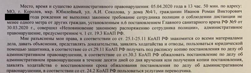 Протоколы составили по двум статьям: о несоблюдении санитарно-эпидемиологического требования о дистанции в 1 метр от других граждан (ч. 2 ст. 6.3 КоАП), а также о неисполнении требования полицейского «о соблюдении дистанции не менее одного метра от других граждан» (ч. 1 ст. 19.3 КоАП).