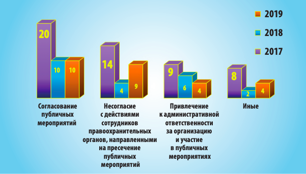 Всего за 2019 год уполномоченная по правам человека получила 27 индивидуальных и коллективных жалоб на нарушение права на свободу собраний. Больше всего жалоб связано с процессом согласования публичных мероприятий и несогласием с действиями силовиков при пресечении публичных мероприятий.