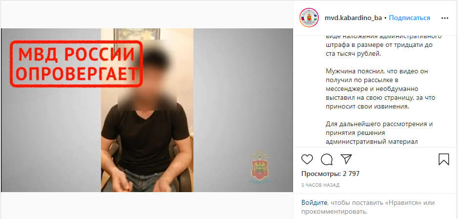 В Кабардино-Балкарии сотрудники полиции заставили мужчину извиниться на камеру за публикацию «фейк-ньюс» о коронавирусе и составили на него протокол о распространении «заведомо недостоверной» информации (ч. 9 ст. 13.15 КоАП). Об этом ведомство сообщило на своей странице в инстаграме.