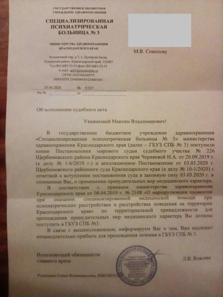 Специализированная психиатрическая больница № 3 Краснодарского края потребовала «незамедлительно» явиться местному жителю Максиму Соколову, которого суд направил на принудительное лечение. В регионе введен режим самоизоляции, и мужчина не может добраться до больницы, которая находится в другом населенном пункте. Об этом Соколов сам сообщил ОВД-Инфо.