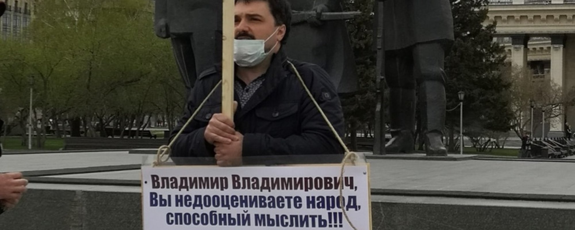 Даниил Цховребов вышел с одночным пикетом на площадь Ленина. Его задержал полицейский, сказал Цховребову, что тот нарушил режим самоизоляции и указ о запрете публичных мероприятий, составил на пикетчика протокол и отпустил под обязательство о явке. Одиночный пикет снимали на видео три дружинницы, патрулировавшие город.