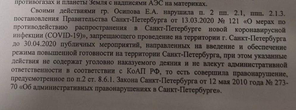 21:58 Общественный защитник Варвара Михайлова опубликовала в своем телеграм-канале фрагмент протокола, составленного на Елену Осипову. Полицейские пишут, что пикетчица нарушила указ о запрете публичных мероприятий в период пандемии и режим «повышенной готовности» (п. 2 ст. 8.6.1 КоАП Петербурга).