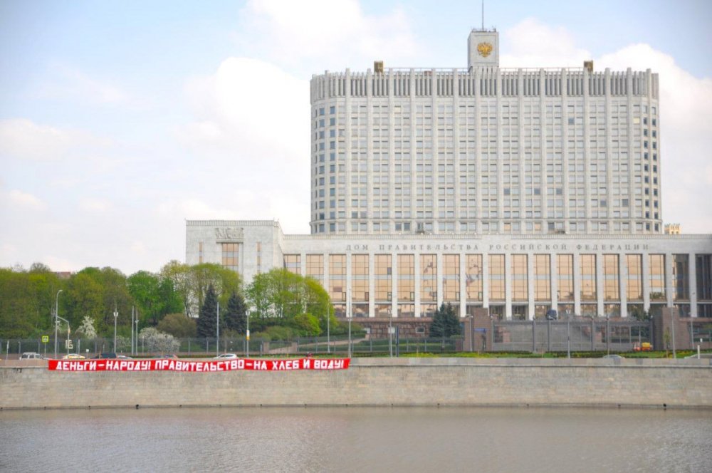 Сегодня утром нацболы провели акцию на краснопресненской набережной. Напротив Дома правительства был вывешен 50-метровый баннер с лозунгом: «Деньги — народу! Правительство — на хлеб и воду!». Тогда никто задержен не был.