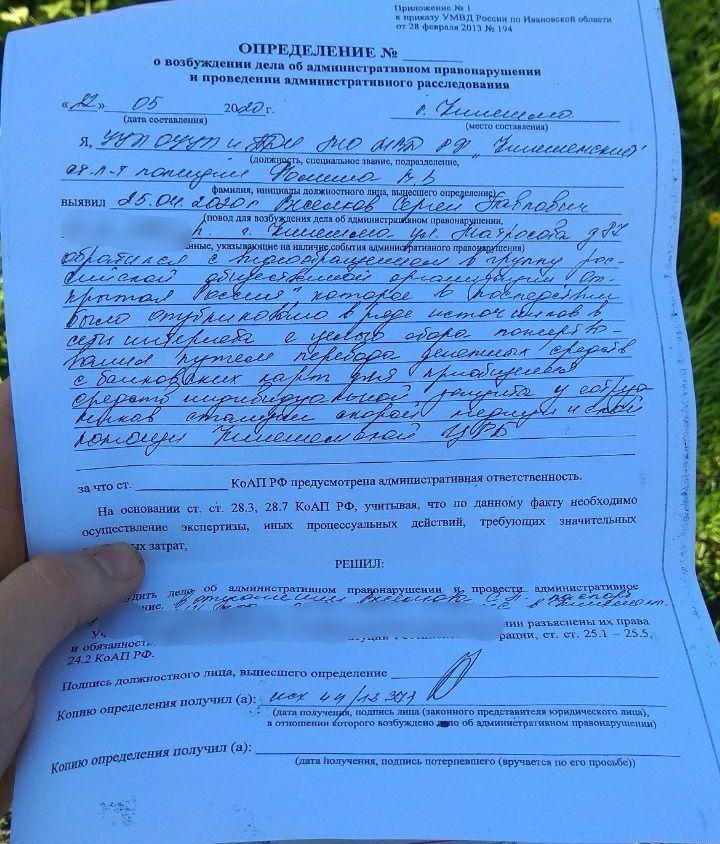 «Обратился с видеообращением в группу российской общественной организации „Открытая Россия“, которое впоследствии было опубликовано в ряде источников сети интернет с целью сбора пожертвований путем перевода пожертвований с банковских карт для приобретения средств индивидуальной защиты у сотрудников станции скорой помощи Кинешемской ЦРБ», — пишут полицейские в определении о возбуждении дела.