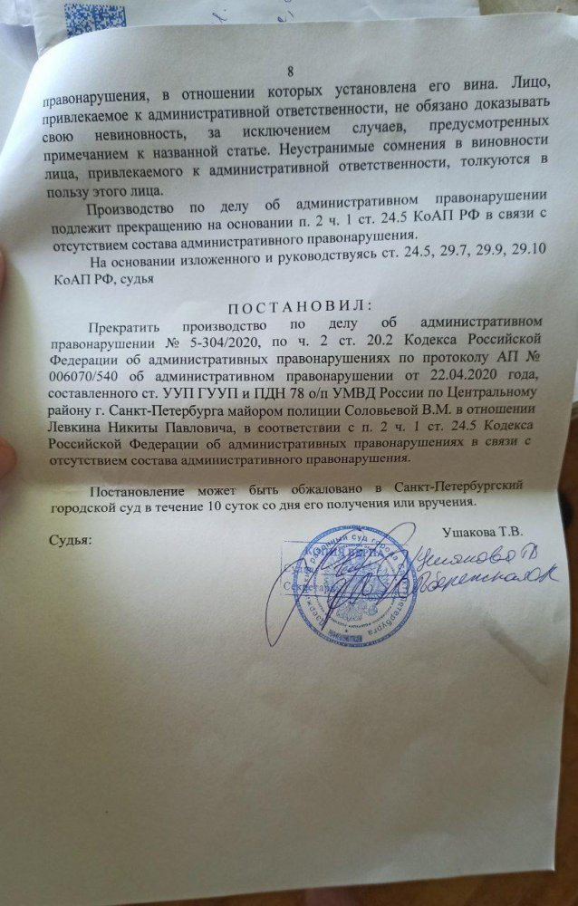 22 июня 13:25 Дело прекратили в связи с отсутствием состава правонарушения. Об этом ОВД-Инфо рассказал Никита Левкин после получения по почте копии постановления суда.