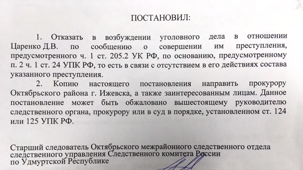 Следственный комитет в Ижевске не стал заводить уголовное дело по результатам проверки высказывания активиста Российского Социалистического Движения (РСД) Дмитрия Морозова в поддержку фигурантов дела «Сети». Об этом ОВД-Инфо рассказал сам Морозов.