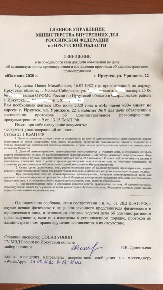 Правозащитника Павла Глущенко, рассказавшего о смерти заключенного после бунта в Ангарской колонии, вызвали в полицию для составления протокола об административном правонарушении. Ему вменяют статью о фейкньюс (ч. 9 ст. 13.15 КоАП). Об этом он сообщил на своей странице в Фейсбук.