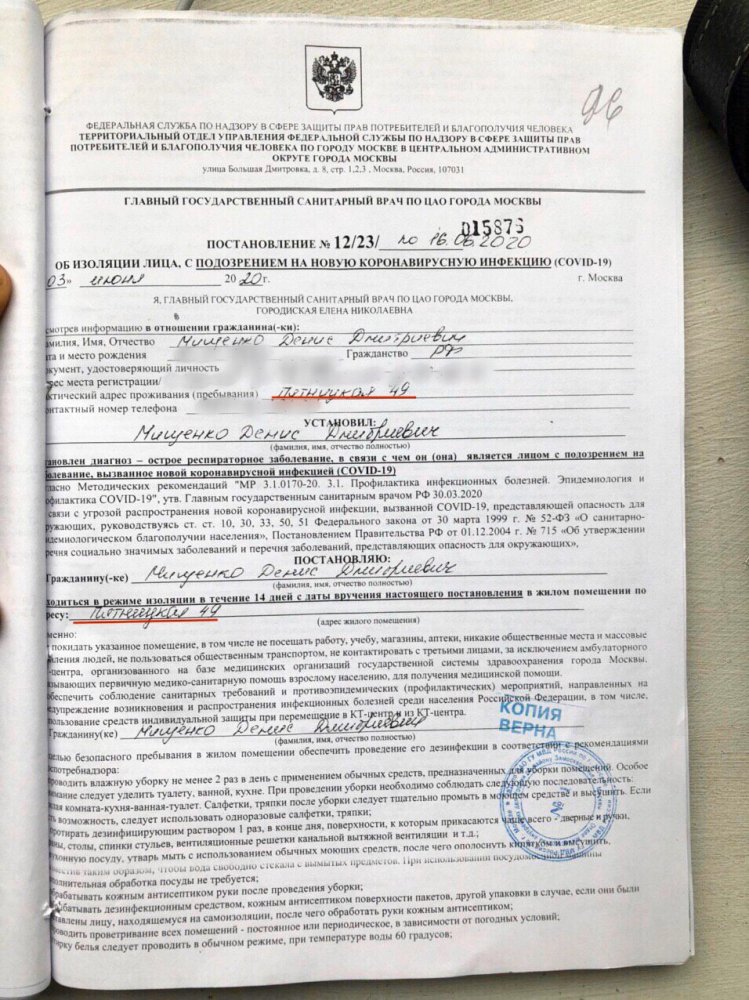 Роспотребнадзор предписал изолировать задержанного на серии пикетов 2 июня Дениса Мищенко в ОВД Замоскворечье в связи с подозрением на коронавирус. Об этом сообщает телеграм-канал «Апология протеста».