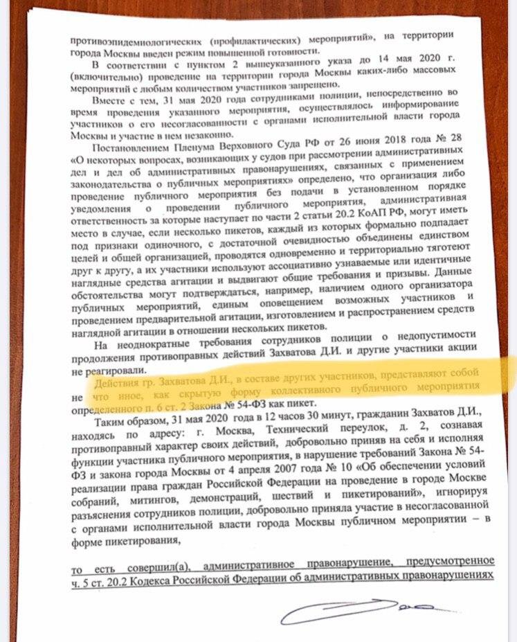 Полицейские выдали задержанным на одиночных пикетах 31 мая адвокатам Дмитрию Захватову и Даниилу Берману протоколы о нарушении правил проведения публичного мероприятия (ч. 5 ст. 20.2 КоАП), сообщается в телеграм-каналах Avocado jazz и «Апология протеста».