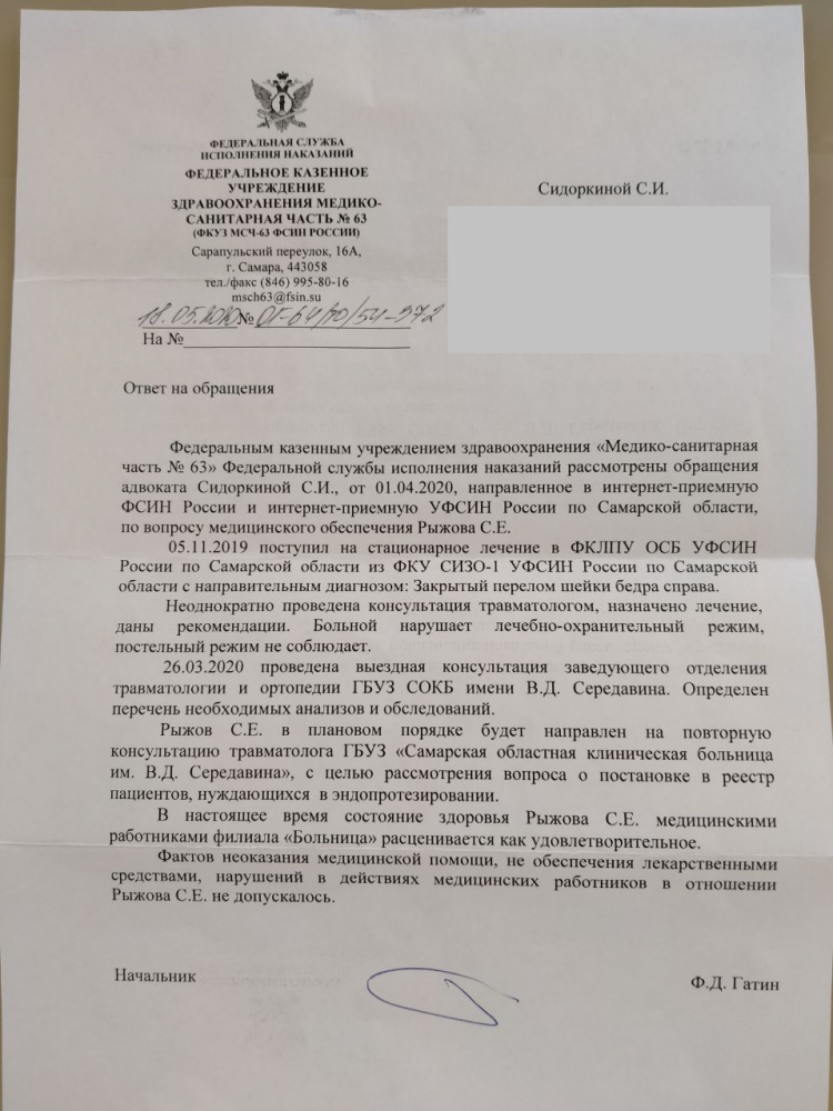 «Медицинская помощь подследственному оказывается в полном объеме. Все обследования проводятся своевременно, что отражено в истории болезни. Однако, в связи с нарушением лечебно-охранительного режима со стороны подследственного, выраженного в несоблюдении рекомендаций врача-травматолога, лечение должных результатов не принесло», — написали в УФСИН по Самарской области.