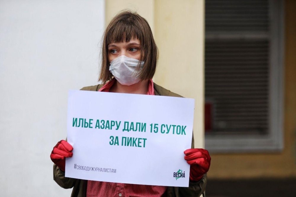 - 28 мая журналиста «Новой газеты» и муниципального депутата района Хамовники Илью Азара арестовали на 15 суток за пикет в поддержку автора «Омбудсмена полиции» и задержанного ранее активиста. Азара признали виновным в повторном нарушении правил проведения акции (ч. 8 ст. 20.2 КоАП). В тот же день журналисты и активисты вышли в его поддержку. В Москве и Санкт-Петербурге задержали 22 человек. На них составили протоколы о нарушении режима самоизоляции и о нарушении правил участия в акции. Двоих оставили на ночь до суда в отделах полиции.