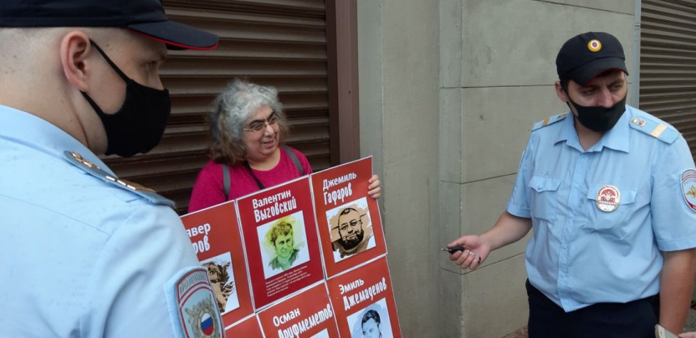 Бажанова стояла с плакатом в поддержку Константина Котова, осужденного за «неоднократные нарушения правил проведения публичных мероприятий», а Ковхаева и Шишканов — в поддержку крымских татар.