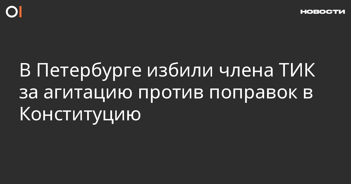 В Санкт-Петербурге избили члена Территориальной избирательной комиссии Евгения Смирнова за агитацию против поправок в Конституцию. Инцидент произошел когда он со своим другом (членом Участковой избирательной комиссии) расклеивал листовки с призывами проголосовать против поправок в Конституцию. Об этом сообщает телеграм-канал «Чайный Клуб».