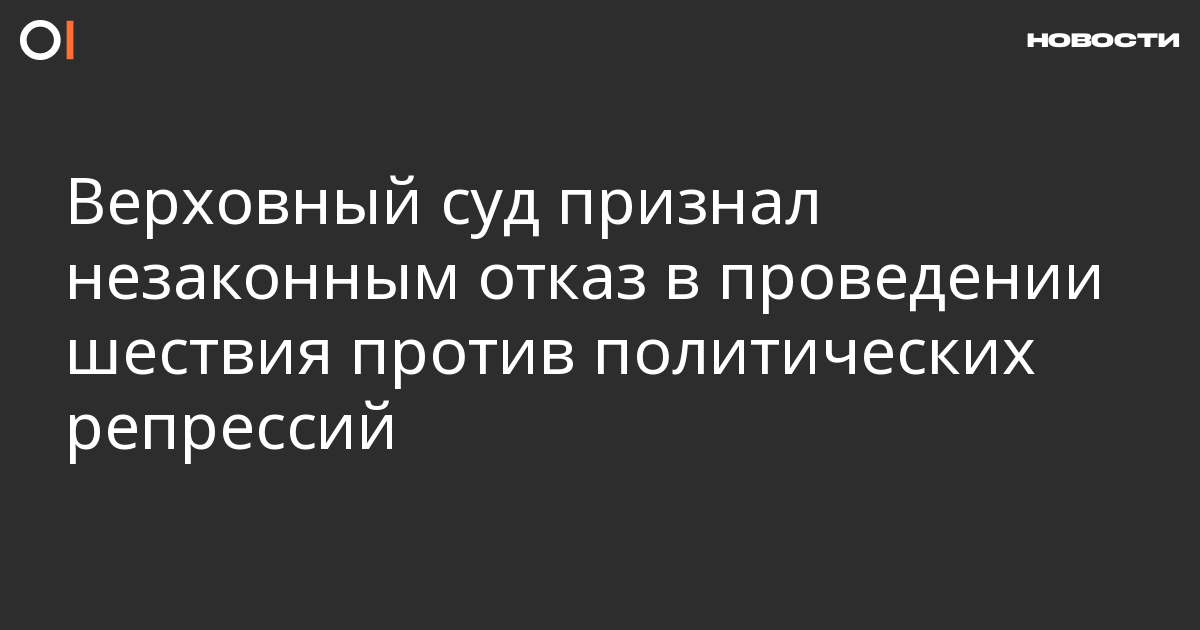 Верховный суд признал незаконным отказ в проведении шествия против политических репрессий, завленного на 3 сентября 2019 года. Об этом одна из организаторов мероприятия, член «Партии перемен» Эльвира Вихарева сообщает в своем телеграм-канале.