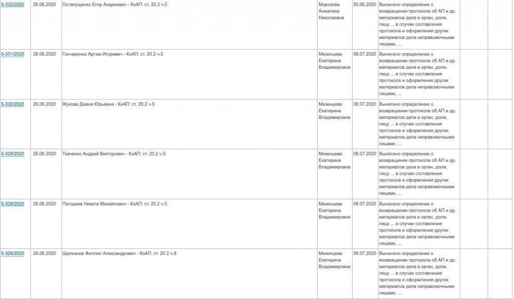 В Санкт-Петербурге 22 июня Второй Западный окружной военный суд огласил приговор фигурантам дела «Сети» Филинкову и Бояршинову. После суда силовики стали задерживать людей, пришедших поддержать обвиняемых. Всего задержали 30 человек, шестерых отвезли в отдел полиции № 76. Там задержанных — Артема Гончаренко, Филиппа Щелканова, Андрея Ткаченко, Никиту Погодаева, Диану Жукову, Егора Остапущенко — оставили в полиции на ночь с протоколами по 5-й части статьи 20.2 (нарушение порядка проведения публичного мероприятия) и статье 19.3 (неповиновение законным требованиям сотрудников полиции) КоАП. Суд вернул именно их материалы дела.
