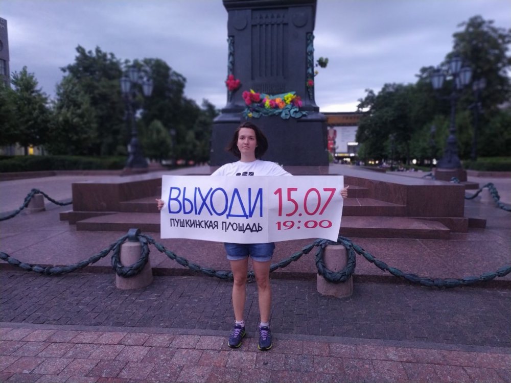 Рядом с памятником Пушкину задержали Миляушу Кашапову, она стояла с плакатом, призывающим выходить на акцию 15 июля против поправок в Конституцию. Об этом ОВД-Инфо сообщил автор телеграм-канала «Avtozak LIVE» Максим Кондратьев.