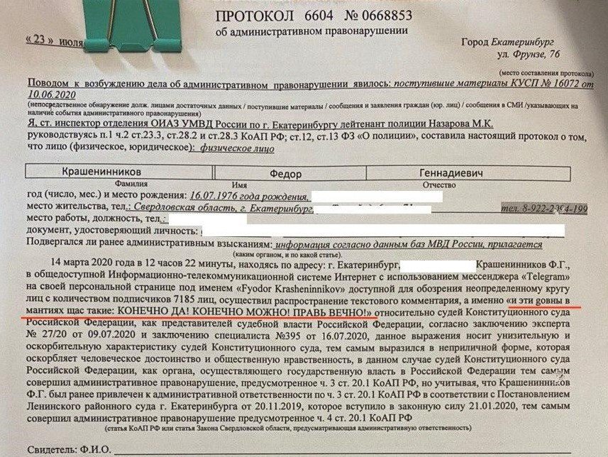 Согласно протоколу, Крашенинников 14 марта в своем телеграм-посте с комментарием о просьбе Владимира Путина дать разъяснения по количеству президентских сроков, оскорбил судей Конституционного суда, назвав их «***нами в мантиях».