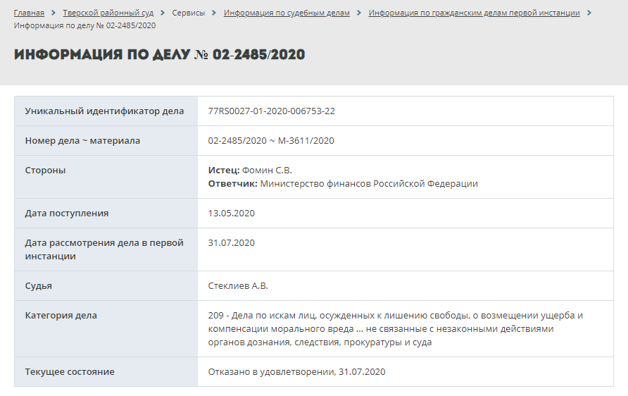 Исковые требования Фомина суд удовлетворил частично: экс-фигурант «московского дела» просил взыскать с государства в его пользу 793 тысячи рублей. При этом в карточке дела Фомина по состоянию на 13 часов 45 минут 31 июля стоит статус «отказано в удовлетворении».