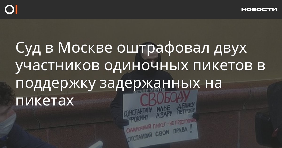 Судья Пресненского районного суда Москвы Ирина Зубова оштрафовала Владислава Барабанова и Александру Калистратову, участников одиночных пикетов в поддержку других задержанных на пикетах. Об этом сообщают адвокаты от ОВД-Инфо Василий Кушнир, который представлял интересы Барабанова в суде, и Мария Эйсмонт, которая защищала Калистратову и Барабанова.