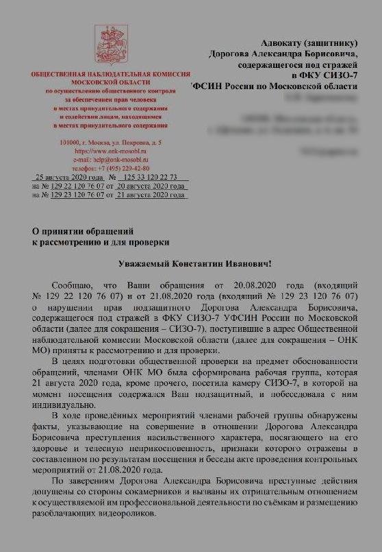После встречи с подзащитным и его рассказа об избиении адвокат обратился в ОНК по Московской области. Члены комиссии приезжали в СИЗО и подтвердили наличие у журналиста телесных повреждений.